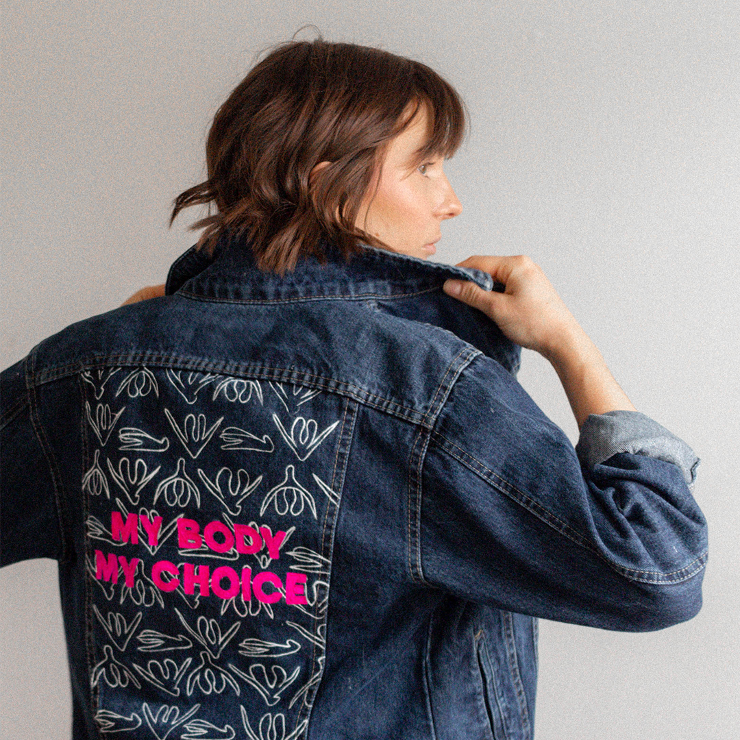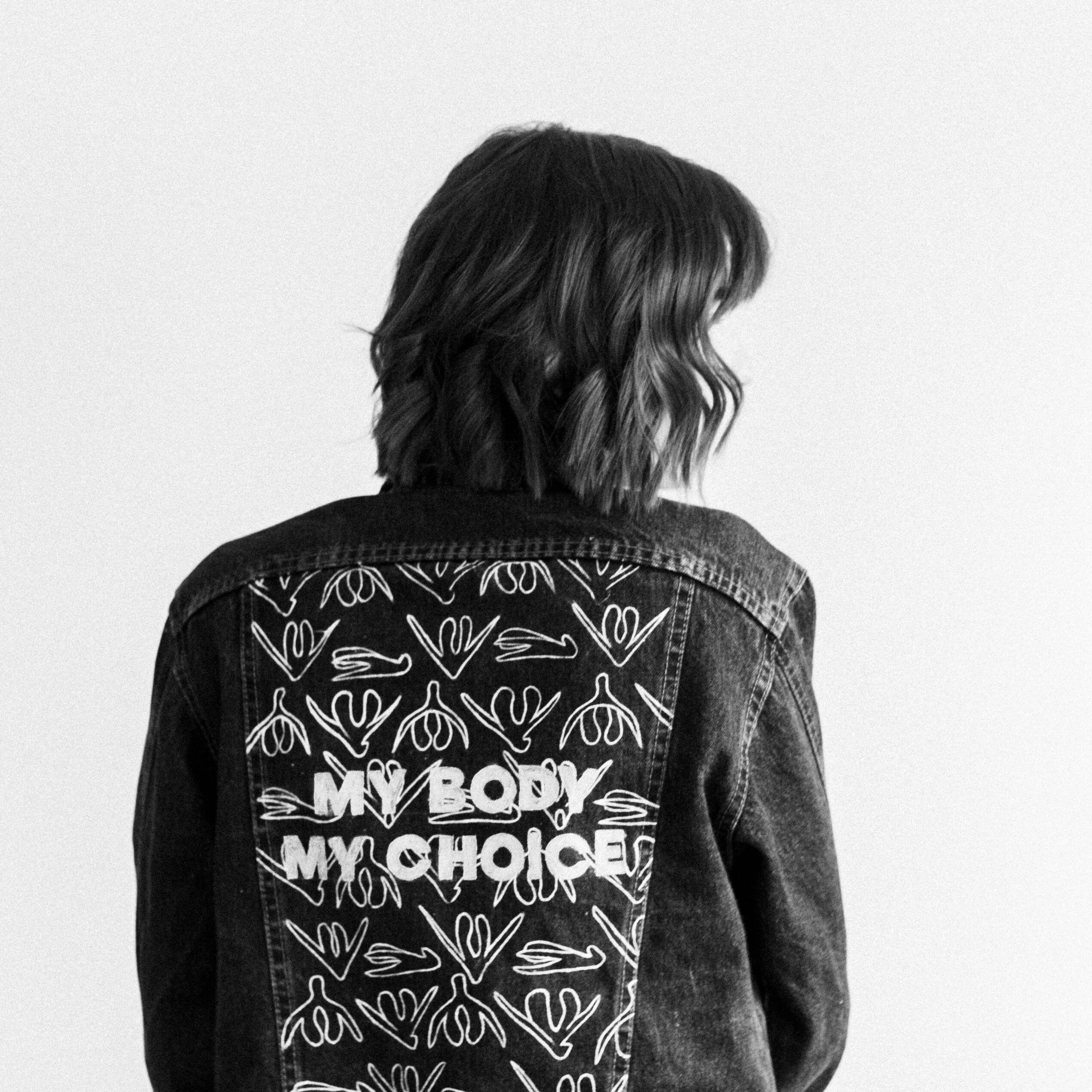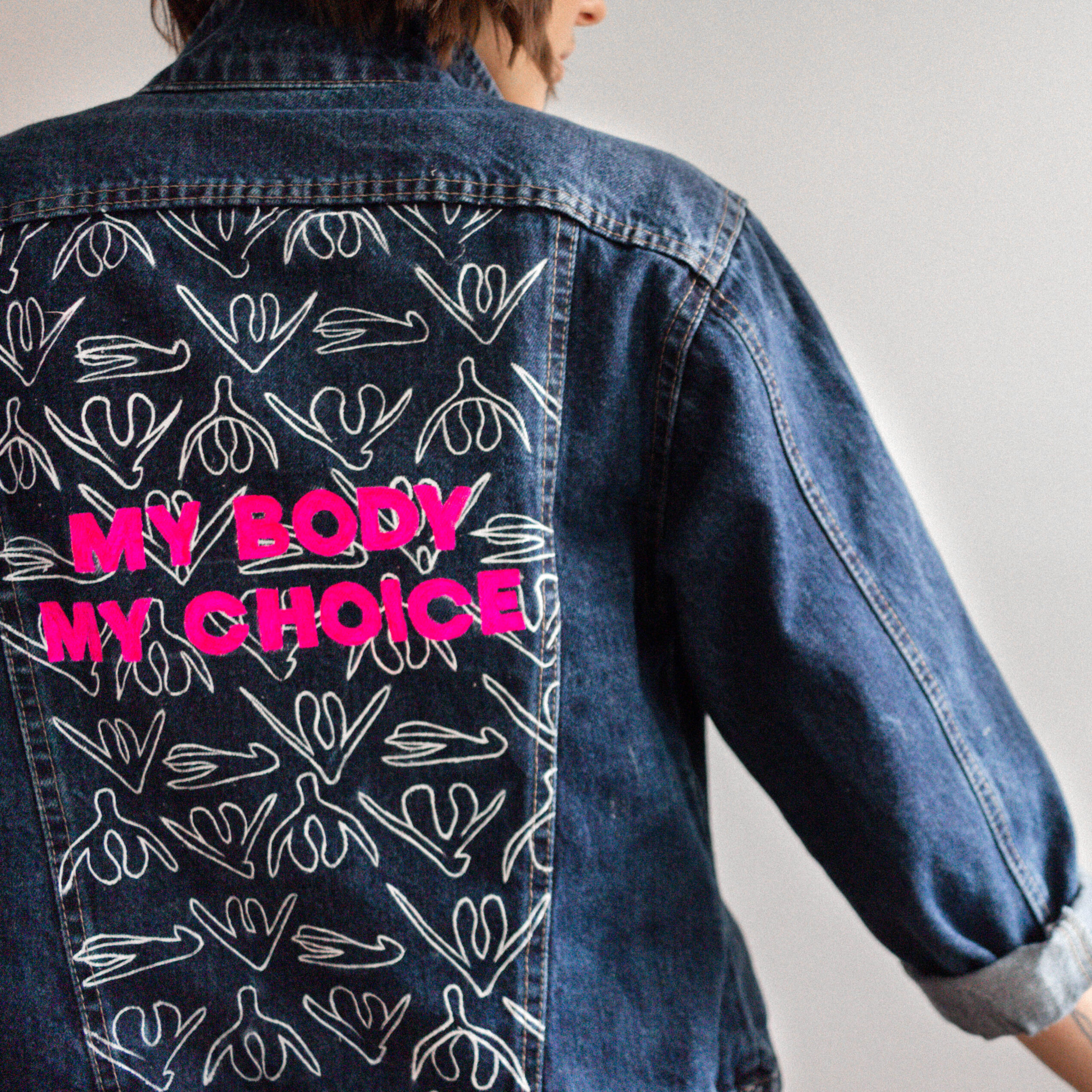 Diese Secondhand-Jacke zeigt verschiedene Klitoris im Hintergrund, gepaart mit einem blauen Text, der lautet „My Body, my choice“. Für das Design wurde waschbeständige Stofffarbe verwendet, aber damit die Farben lange leuchtend bleiben, empfehlen wir, die Jacke mit der Hand zu waschen.