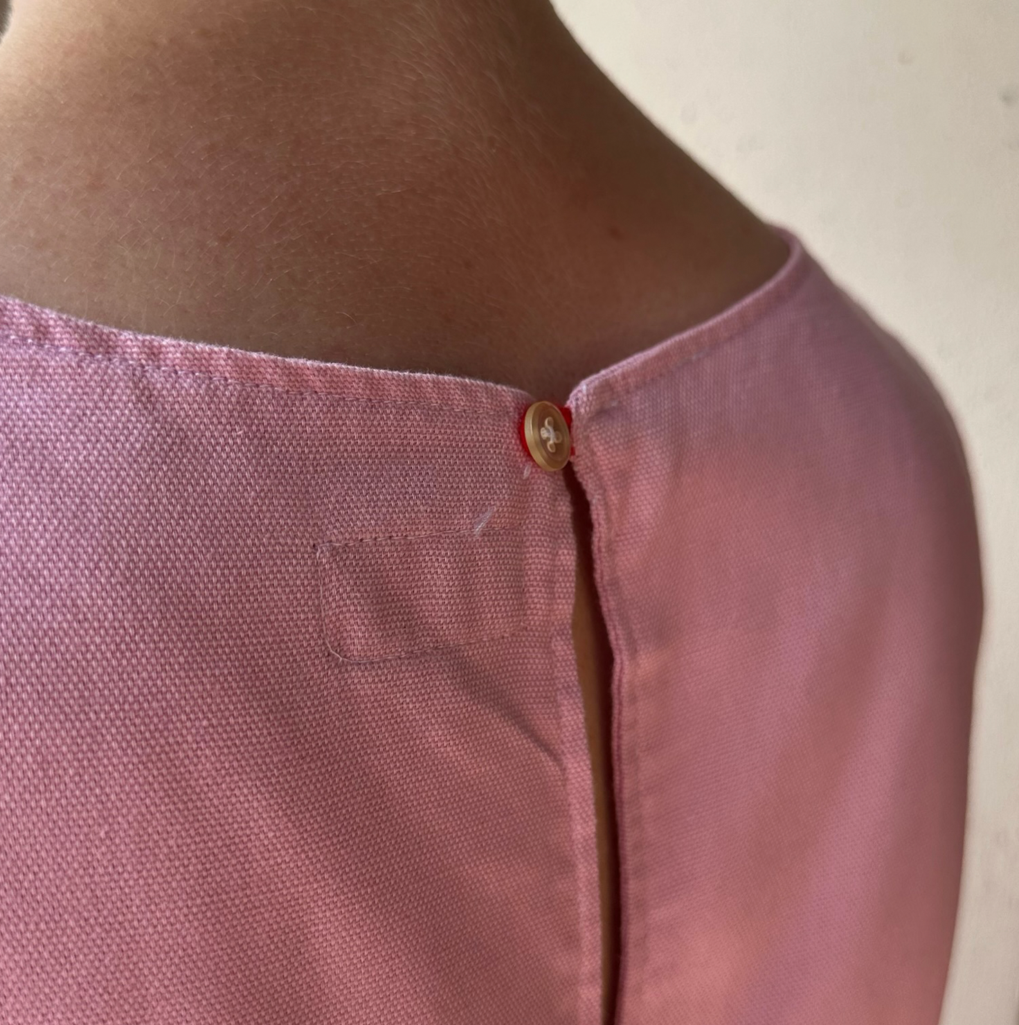Mit seinem lockeren Schnitt sorgt er für eine entspannte Passform und viel Bewegungsfreiheit. Ein farbiger Knopf am Rücken fügt dem ansonsten neutralen Design einen charmanten Farbakzent hinzu und macht den Look komplett.