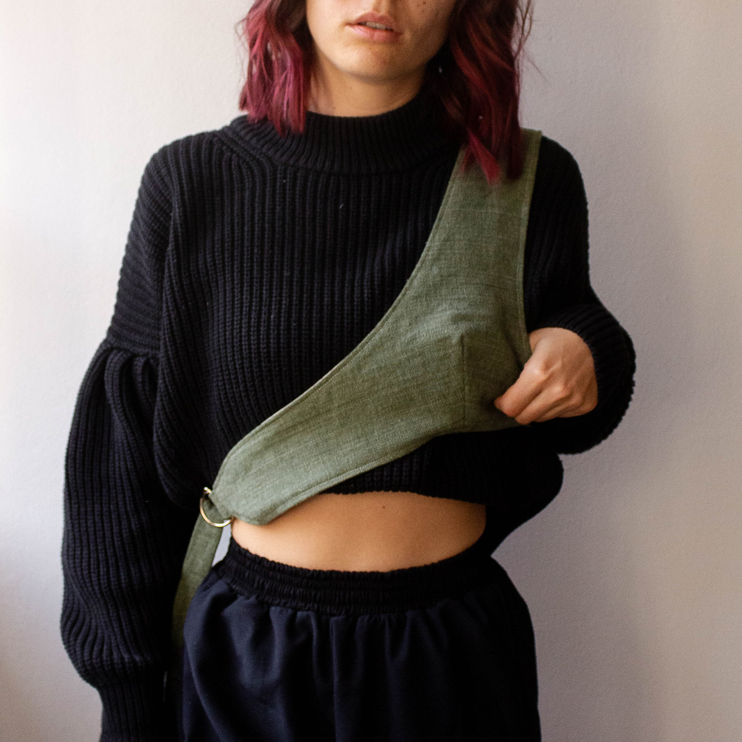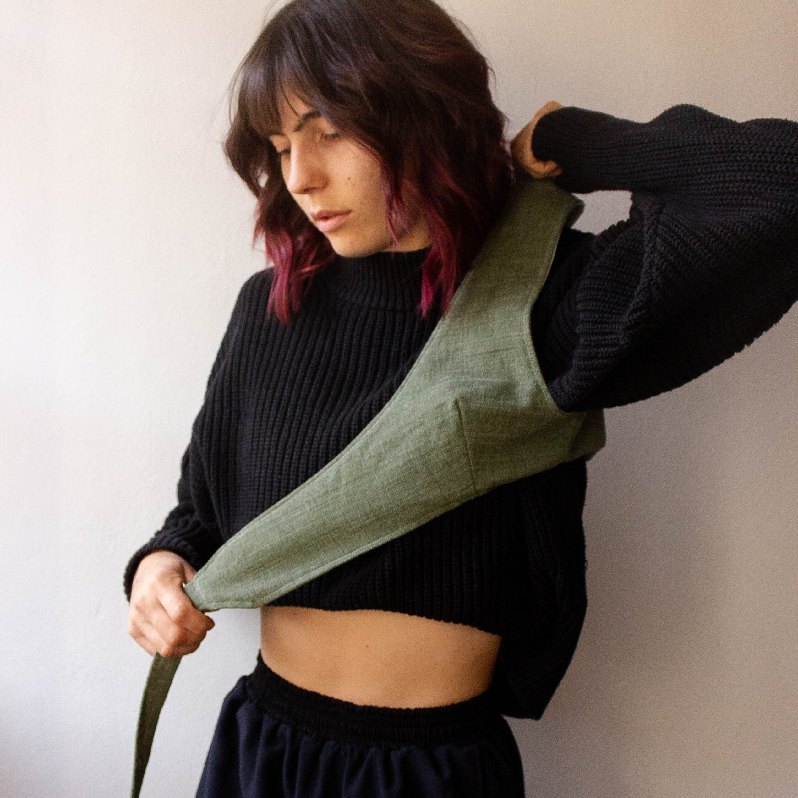 Das Sage Top wird handgefertigt aus Stoffresten von Polstermöbeln. Auch das Innenfutter besteht aus übrig gebliebenen Stoffen.